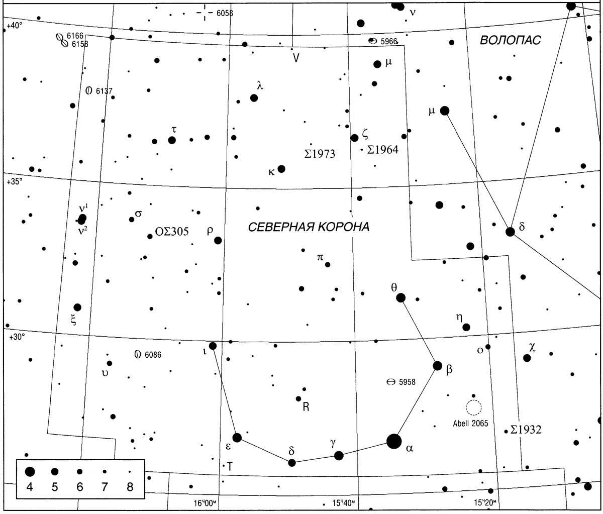 Северная корона (Corona Borealis)– одно из древнейших созвездий. Впервые оно описано и внесено в каталог Клавдия Птолемея «Альмагест» во 2 веке. Первоначальное его наименование – Корона (или Венец).