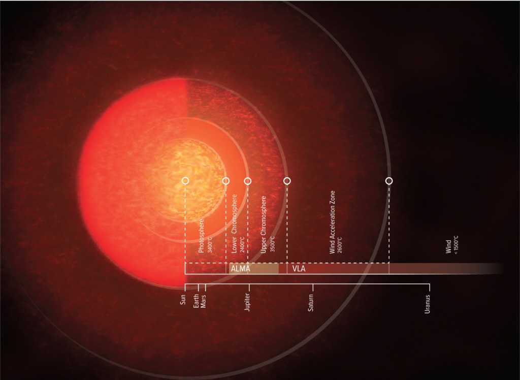Антарес и его атмосфера. Если бы звезда находилась в центре Солнечной системы, то ее граница пролегала где-то между орбитами Марса и Юпитера. Далее почти до орбиты Юпитера следовала бы нижняя, плотная атмосфера с температурой 2400°С. Верхний, более горячий слой хромосферы, простирается к Сатурну. Наконец, самые внешние слои атмосферы уходят к окраинам Солнечной системы, где находится планета Уран. Рисунок: NRAO/AUI/NSF, S. Dagnello