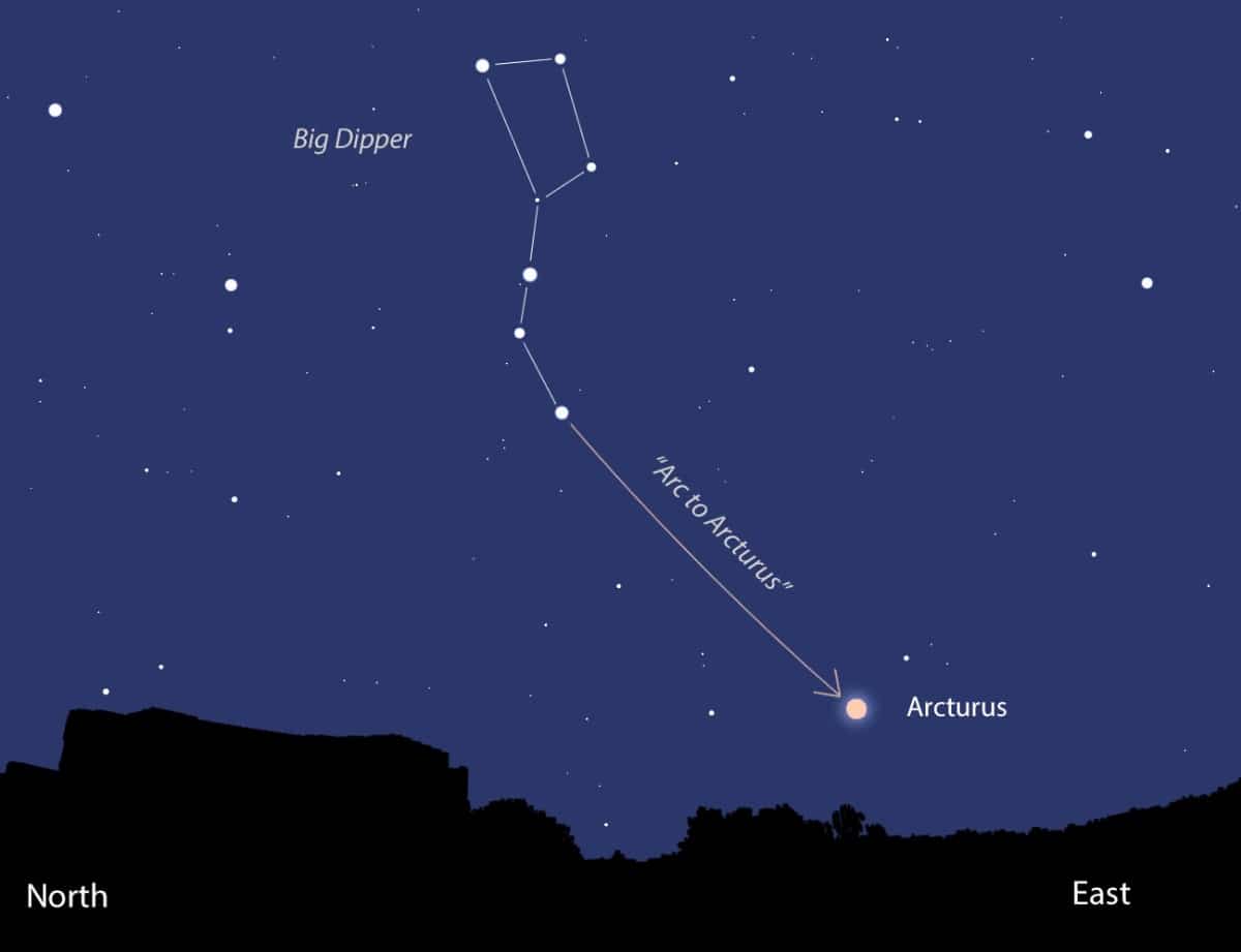 Арктур — одна из самых простых звезд для поиска. Она не только исключительно яркая и является частью двух выдающихся весенних астеризмов, но и на нее указывают три звезды на рукоятке Большой Медведицы – Алиот, Мицар и Алькаид. Арктур и Спика являются частями Весеннего Треугольника и Бриллиант Девы — двух астеризмов, которые заметны на небе во время весны в северном полушарии. Третья вершина Весеннего треугольника отмечена ярким Регулом. Иногда за астеризм принимают меньший равносторонний треугольник, образованный Арктуром, Спикой и Денеболой во Льве.