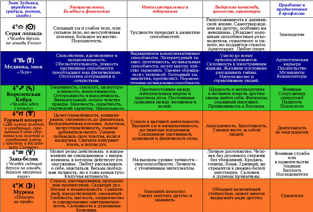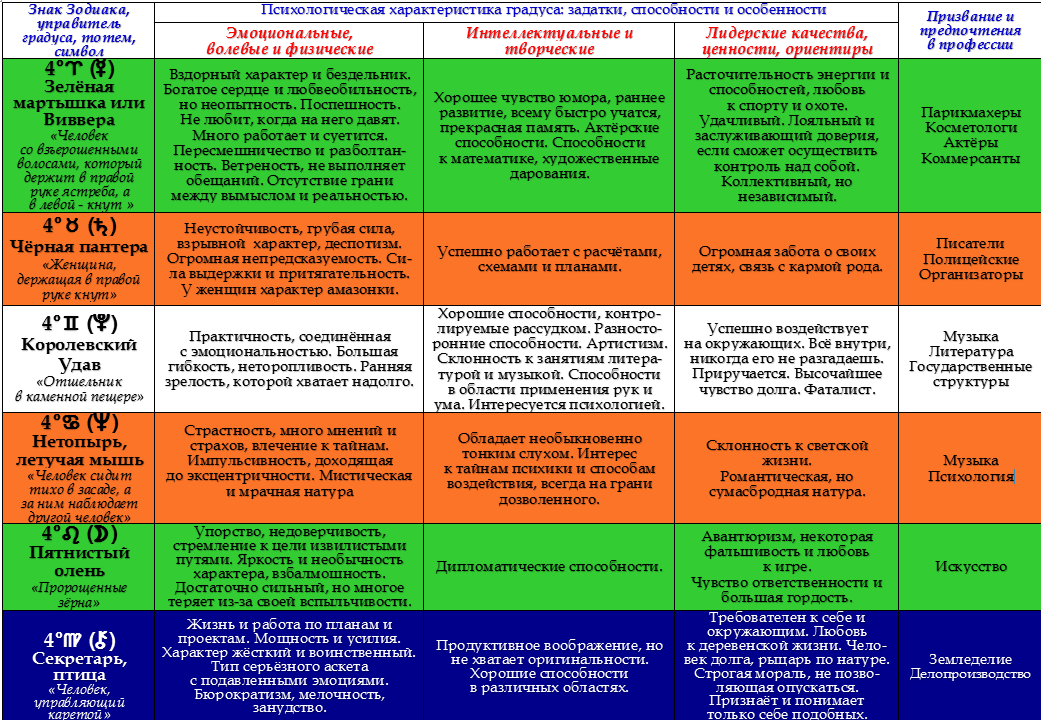 Психологическая составляющая градуса имеет разноплановые, а зачастую и противоречивые характеристики, предоставляя возможность человеку самому определять, как использовать свои задатки и способности в повседневной жизни. Градус несёт в себе многоуровневую информацию и предоставляет возможность обучения и развития в зависимости от потребностей, духовного уровня и мировоззрения. Психологическое наполнение градуса может проявиться в личности человека в различной степени. Это зависит от силы, статуса и аспектации планеты, попавшей в тот или иной градус при рождении (такую информацию может предоставить только астролог). Но самое главное – это отношение самого человека к имеющемуся личностному потенциалу и умение различать Добро и Зло. Использовать при этом данные Небесами сокровища, воплощённые в индивидуальных особенностях Тела, Души и Духа, лучше своевременно, уместно и в меру.