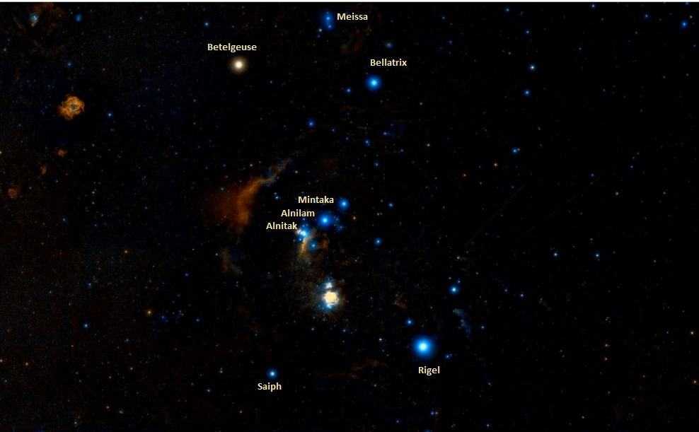 Две самые яркие звезды Ориона ‒ Ригель и Бетельгейзе ‒ находятся почти на равном расстоянии от пояса, по разные стороны от него: Бетельгейзе вверху слева, а Ригель внизу справа. Бетельгейзе образует левое плечо Ориона, а Ригель правую ступню охотника. Правое плечо обозначено звездой Белатрикс, а левая нога звездой Саиф.