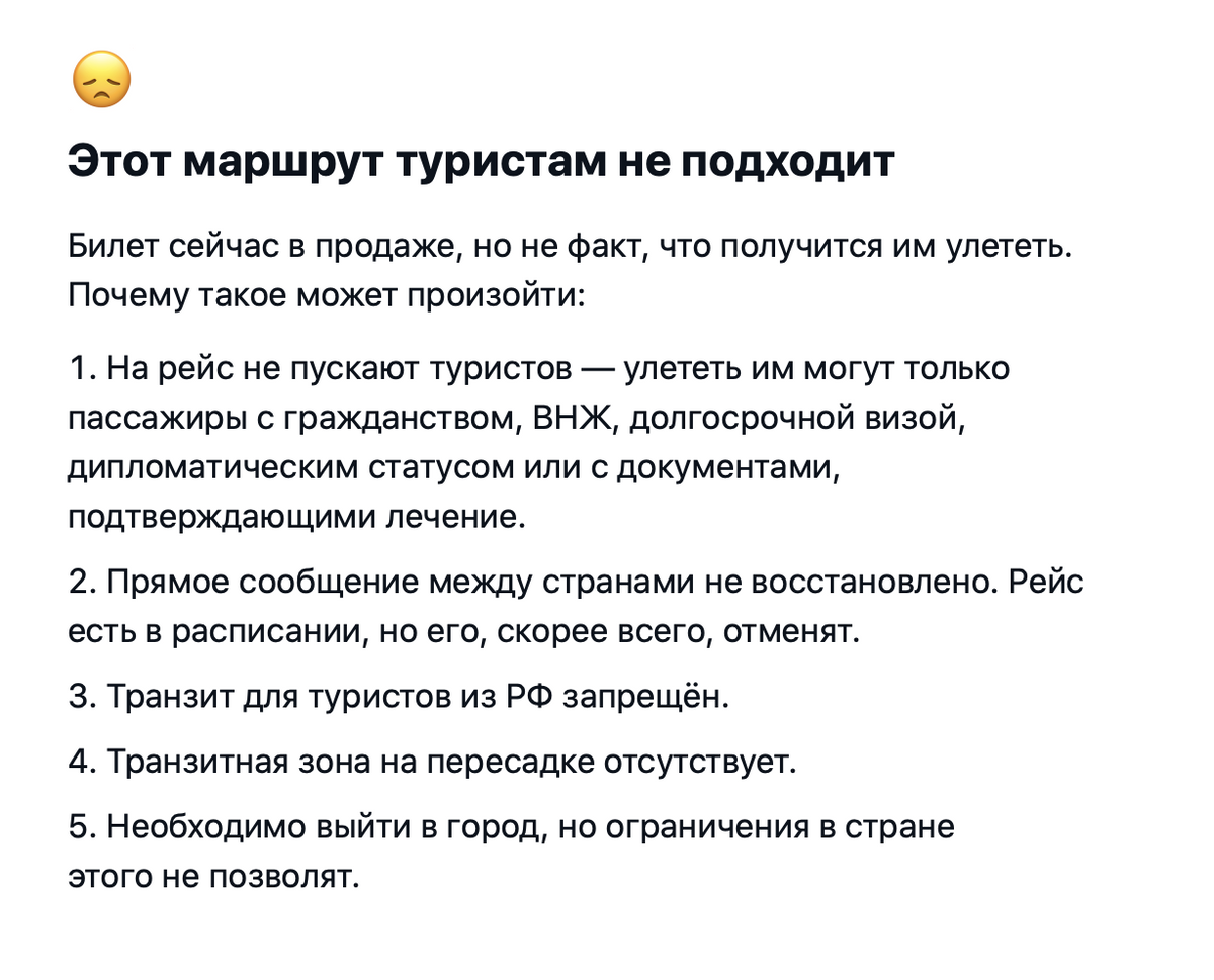 На «Авиасейлсе» при попытке купить рейс Pegasus с пересадкой в Турции вылезло предупреждение, что маршрут не подходит туристам