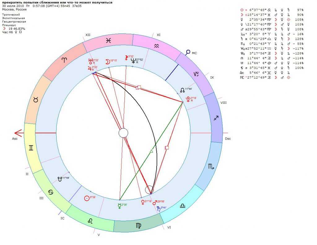 Хорарный вопрос: «Прекратить попытки сближения или может что-то получиться? 30.07.2010г. 0:57 Москва +4