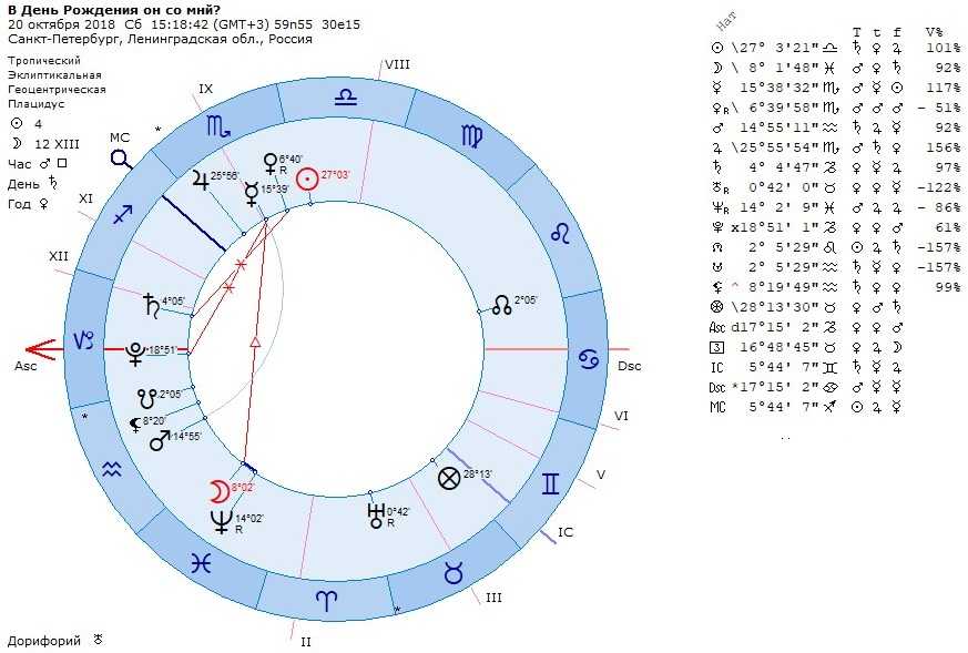 Вопрос был задан 20 октября 2018г. В 15:18. Я в этот момент находилась в Санкт-Петербурге, и построила хорарный гороскоп на свое местоположение.