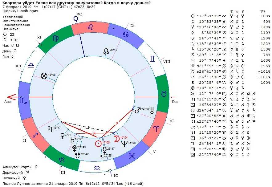 Данный хорарный гороскоп имеет долгую историю. Несколько лет я безрезультатно продавала квартиру. И наконец наступило оживление на рынке московской недвижимости, стали поступать звонки. Купить квартиру изъявила желание дама по имени Елена. 31 января ей был внесен аванс, после чего наступила зловещая тишина. Изначально договорились о сделке 1 марта, приступили к сбору необходимых документов. Но агент Елены на связь не выходил, составление договора заметно затянулось. Возникли сомнения, и я составила хорарную карту.