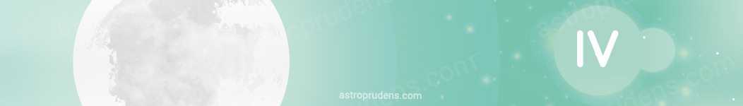 Когда прогрессирующая Луна переходит в 4-й дом, мы находимся в конце одного цикла и в начале нового. Следовательно, это время внутренней подготовки, воспоминаний дома, частного решения всевозможных личных вопросов и развития более подходящей и защитной атмосферы, в которой мы вступаем в новый цикл. Поскольку 4-й дом — угловой, это время большой активности.
