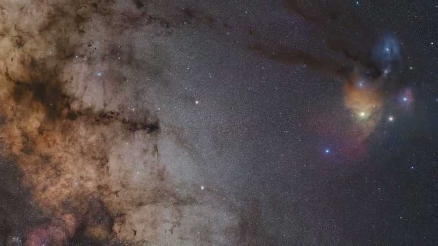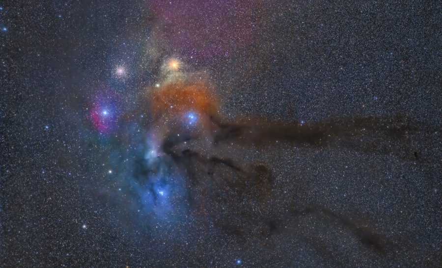В юго-восточной части Змееносца находится один из самых красивых регионов Млечного Пути. Располагаясь всего в нескольких градусах от центральных областей Галактики, находящихся в Стрельце, этот регион наполнен прекрасными звездными полями. Уже в бинокль в этом направлении видны тысячи, десятки тысяч звезд! Эти поля повсеместно разбиты и пересечены темными, почти беззвездными пятнами. Это темные туманности — холодные газопылевые облака, концентрирующиеся к центральной плоскости Млечного Пути.