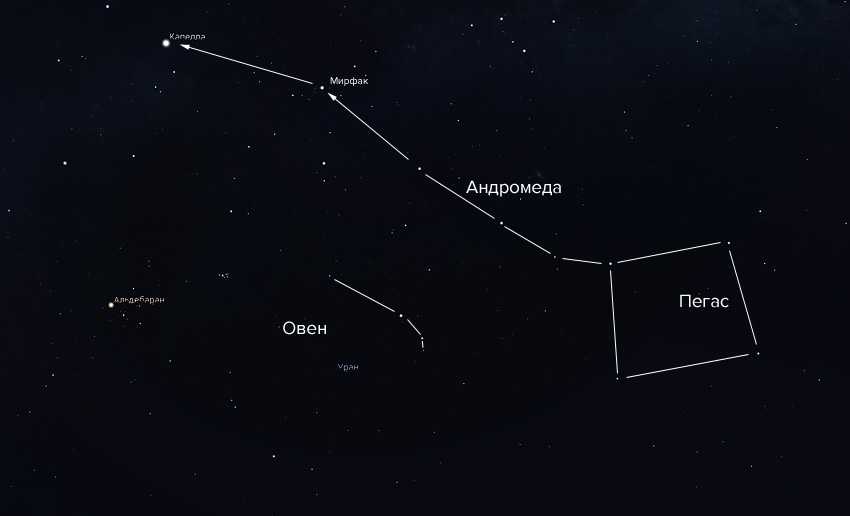 Созвездие Овна находится под цепочкой звезд Андромеды. Рисунок: Stellarium