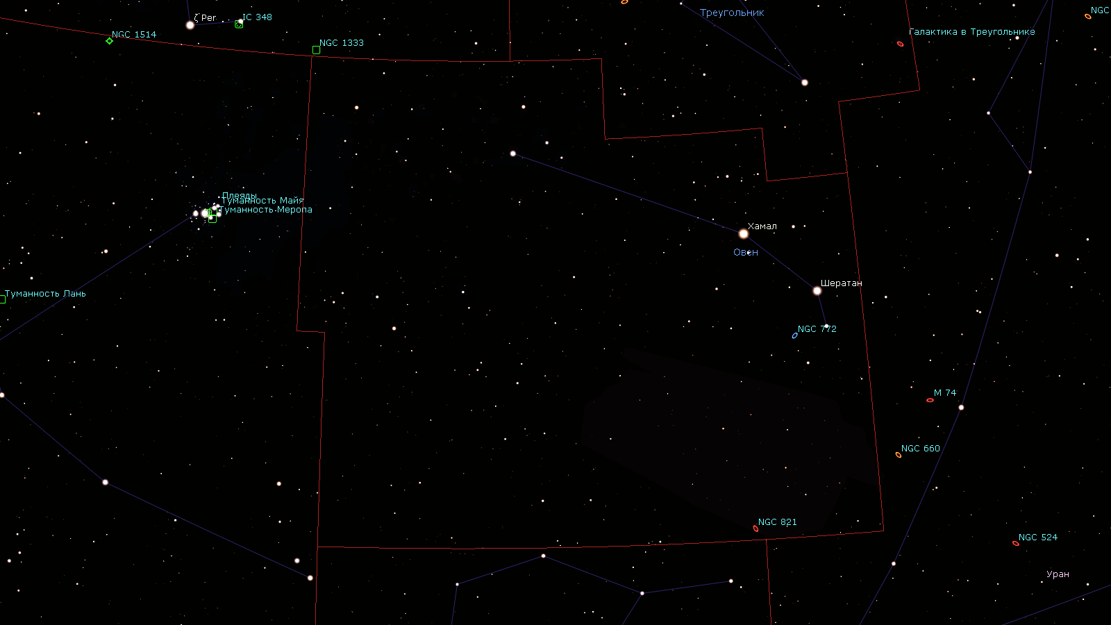 Так вот, созвездие Овна находится слева (восточнее) от Квадрата Пегаса под цепочкой звезд Андромеды.