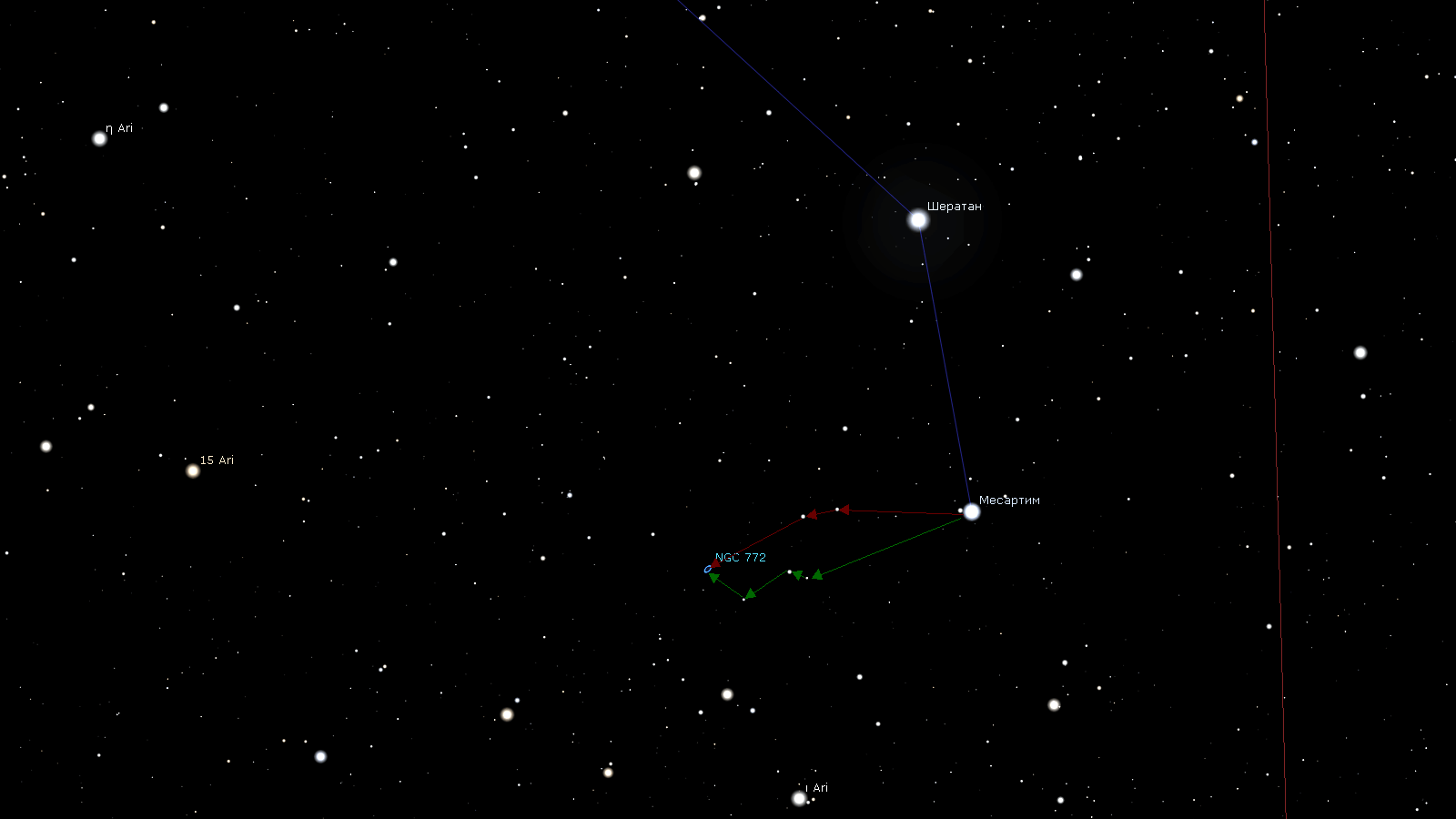 Спиральная галактика NGC 772 расположена недалеко от кратной звезды Месартим (γ Ari), ее светимость составляет 10,3 м, а видимый размер — 7,2 × 4,3, она находится на расстоянии 130 миллионов световых лет от солнечной системы.