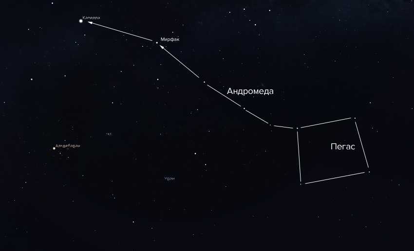 Квадрат Пегаса и Андромеда вместе образуют на небе фигуру, похожую на огромный ковш или на курительную трубку. Цепочку звезд Андромеды можно продлить дальше на восток, к ярким звездам Мирфак и Капелла. Рисунок: Stellarium