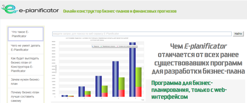 Программа для бизнес-планирования E-planificator имеет веб-интерфейс. В личном кабинете на сайте пользователь может создать бизнес-план любой сложности. Программа упрощает ввод и вывод информации при составлении плана, облегчает финансовое моделирование и позволяет описывать с помощью вводных форм большую часть экономических процессов, которые возникают при функционировании реального современного предприятия.