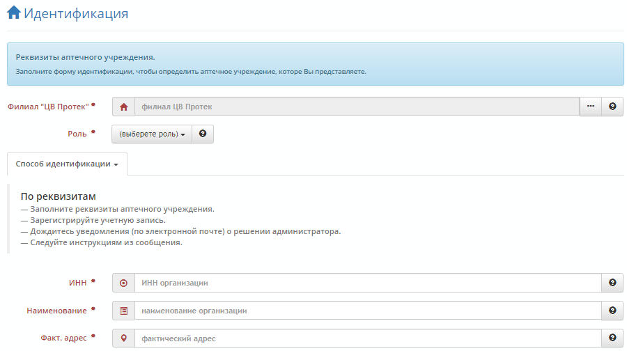 В разделе «Идентификация» введите данные своей аптеки – название, адрес, ИНН. Здесь нужно указать, в какой роли регистрируется пользователь – заведующий, директор, бухгалтер, фармацевт, первостольник.