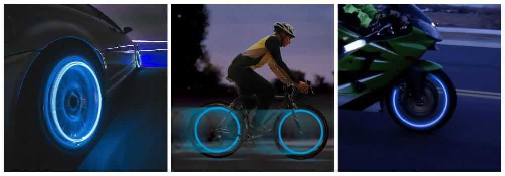 LED-подсветка для колес — отличный способ стать заметным. Это прекрасный подарок для автолюбителя — разноцветные светодиоды можно установить на машину, превратив «железного коня» в уникальный дизайнерский концепт-кар. Подсветка работает только во время движения и только в темное время суток.