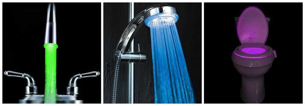 Еще один вариант интерьерного декора, но уже исключительно для ванной комнаты — разноцветная подсветка для сантехники. Кроме эстетической составляющей, они обладают еще и полезным функционалом. Насадка на душ или диффузор для крана помогут определить оптимальную температуру воды: если идет горячая, она светится красным, если холодная — синим. Светодиоды для унитаза позволят экономить электричество — включать свет не будет необходимости. Кстати, в большинстве таких девайсом предусмотрена функция смены оттенков. Захотели розовый унитаз? — Пожалуйста! Хотите зеленый? — Один момент!