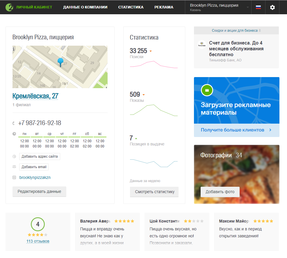 - Пакет «Приоритет»: содержимое пакета «Базовый» + размещение логотипа компании на карте и приоритетное размещение в профильной рубрике. Стоимость в Казани — от 9 345 р./мес. В Москве — от 12 237 р./мес.