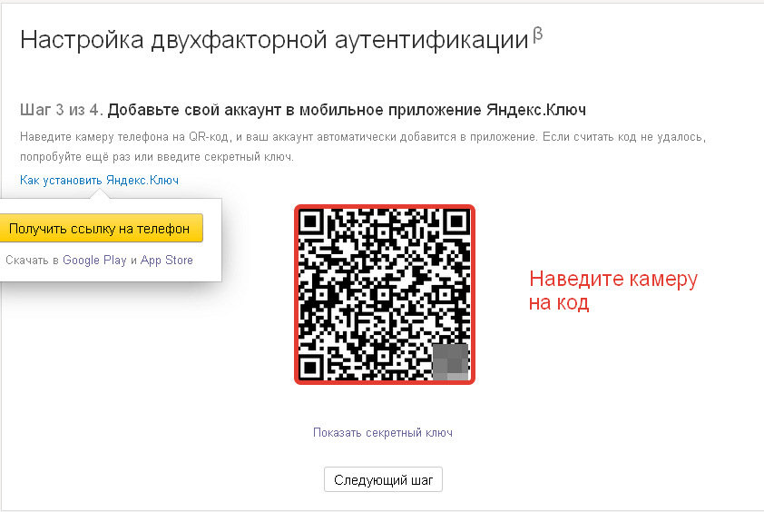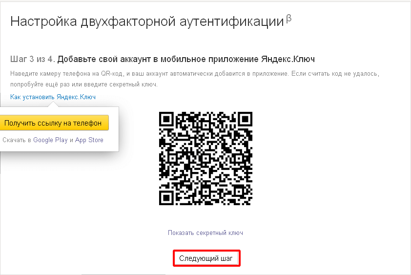 Приложение Яндекс.Ключ требуется для генерации одноразовых паролей для аккаунта. Можно отправить ссылку для установки приложения прямо на экране настройки двухфакторная аутентификации, а можно загрузить приложение из магазина приложений App Store или Google Play.