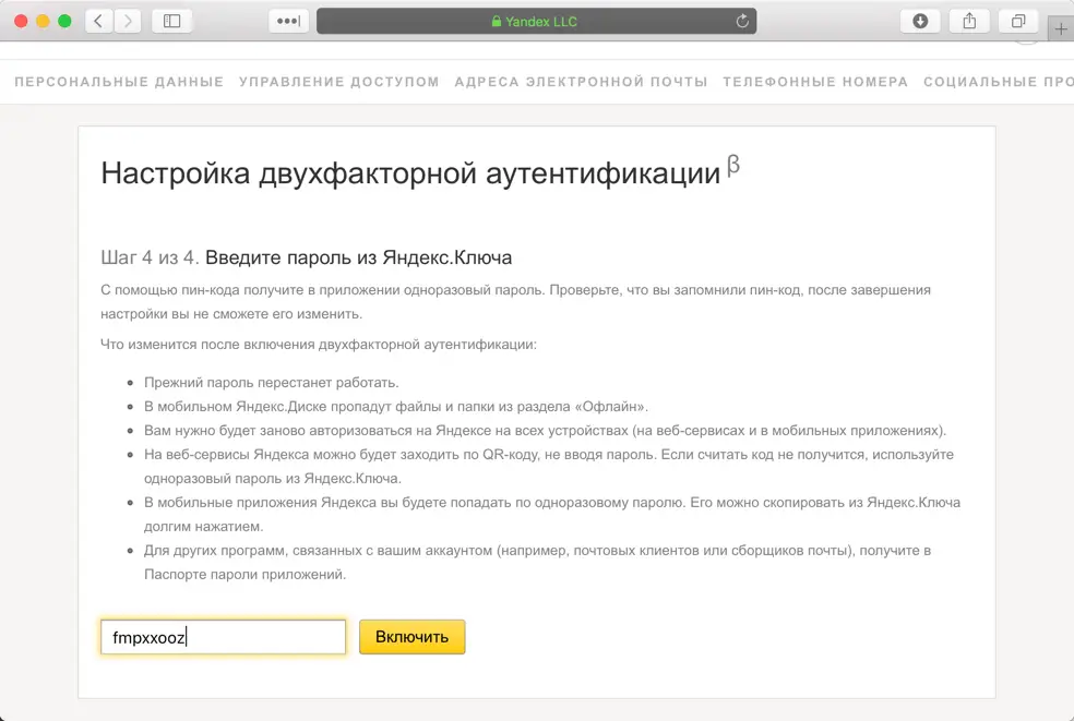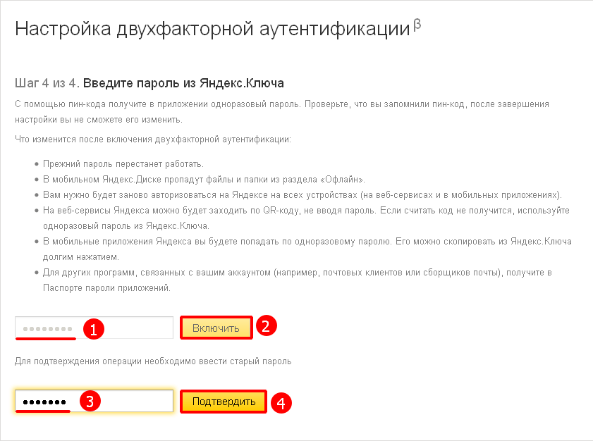 Просто введите ПИН-код, созданные на шаге 2 в приложение Яндекс.Ключ. Приложение сгенерирует одноразовый пароль. Введите его рядом с кнопкой “Включить”, а затем нажмите кнопку.