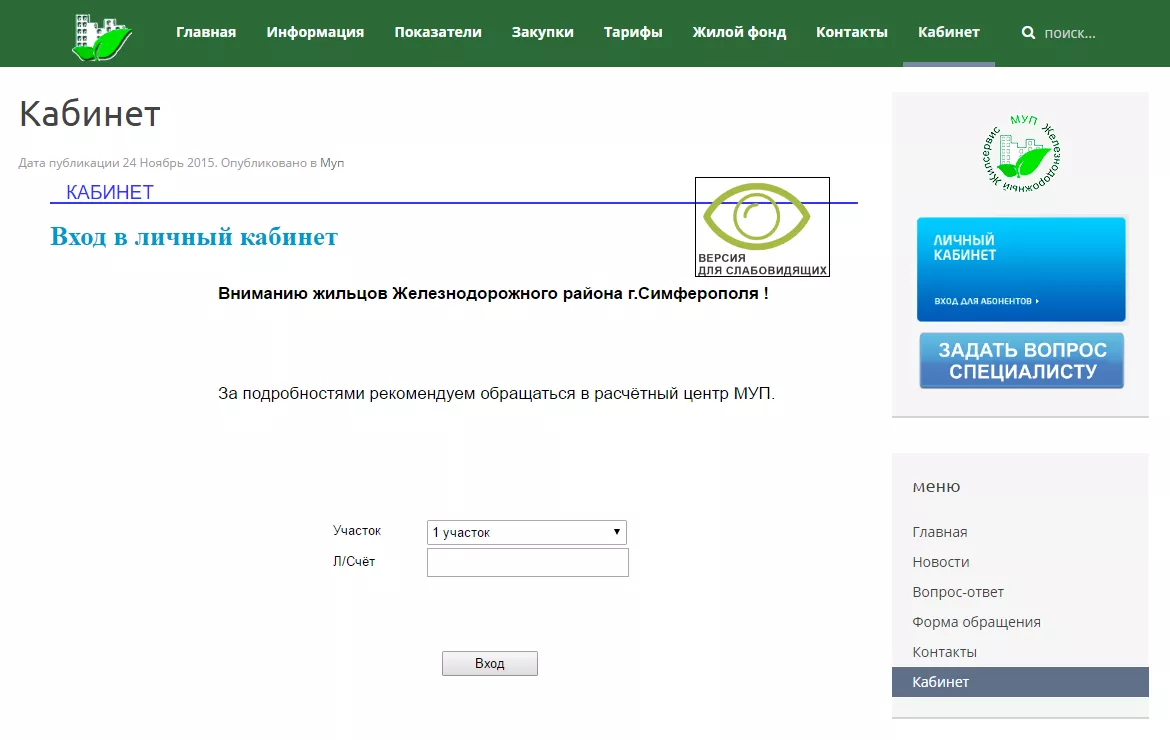 Личный кабинет Жилсервис (г. Симферополь) разрабатывался для упрощения обслуживания клиентов. Основные возможности касаются информирования: