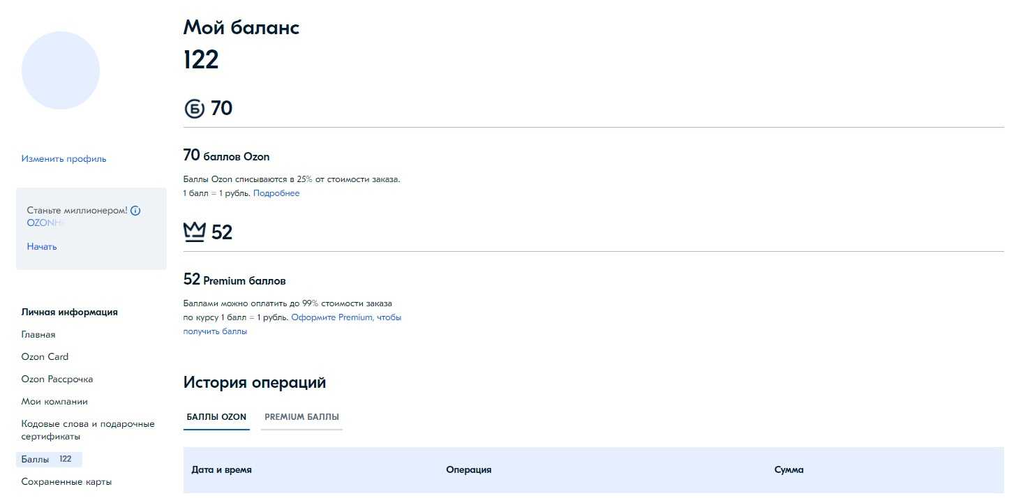 Ozon. На главной странице маркетплейса в верхнем правом углу можно увидеть количество уведомлений о заказах, избранных товарах и продуктах в корзине. При наведении на аватар пользователя всплывает краткое меню с предложениями компании, информацией о накопленных бонусных баллах, сообщениями, ссылкой на поле для промокодов.