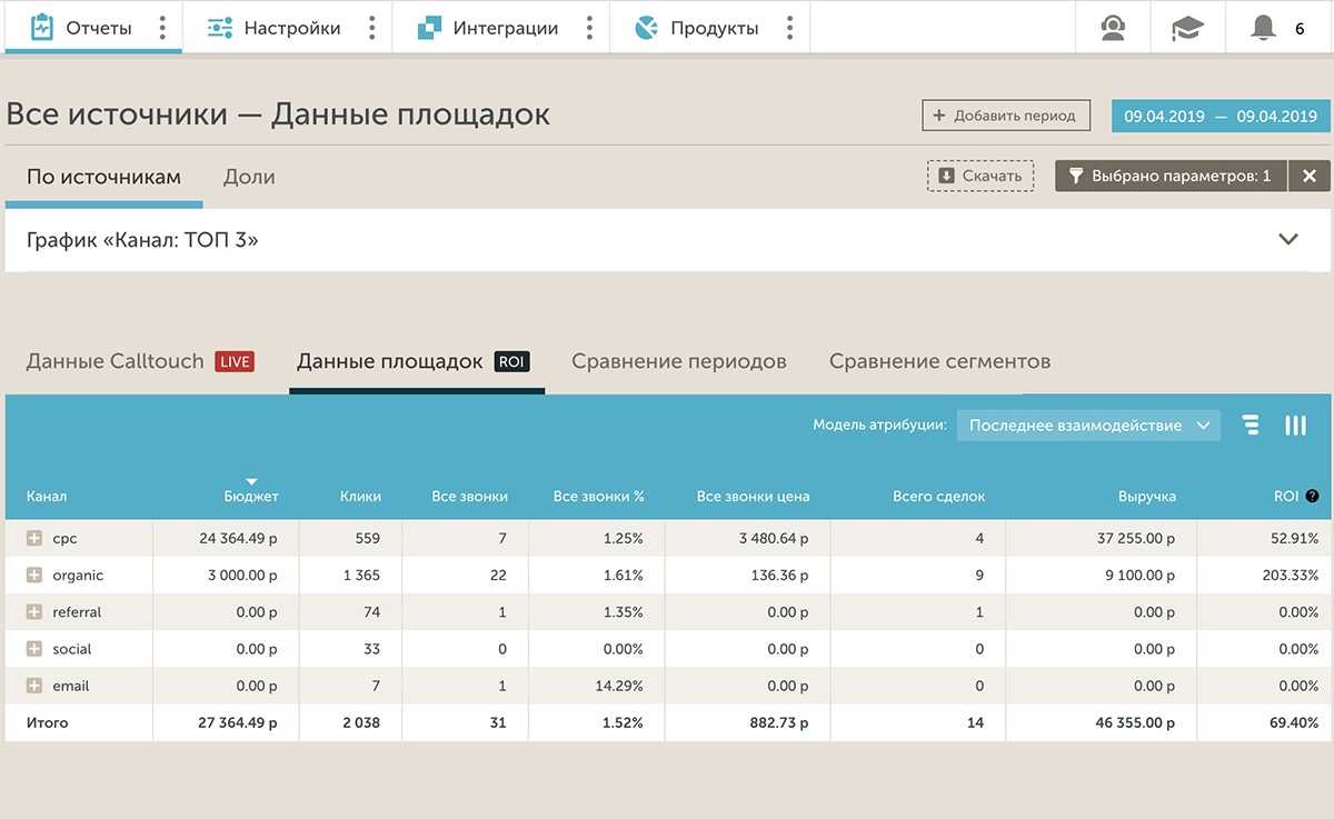 Calltouch. Структура личного кабинета отличается от вышеописанной стандартной: есть только верхнее меню с разделами сервиса и рабочее пространство. В примере представлены источники трафика, с которых клиенты переходят на сайт и совершают звонки. Вы можете отследить их с помощью коллтрекинга Calltouch и оценить эффективность рекламных площадок.