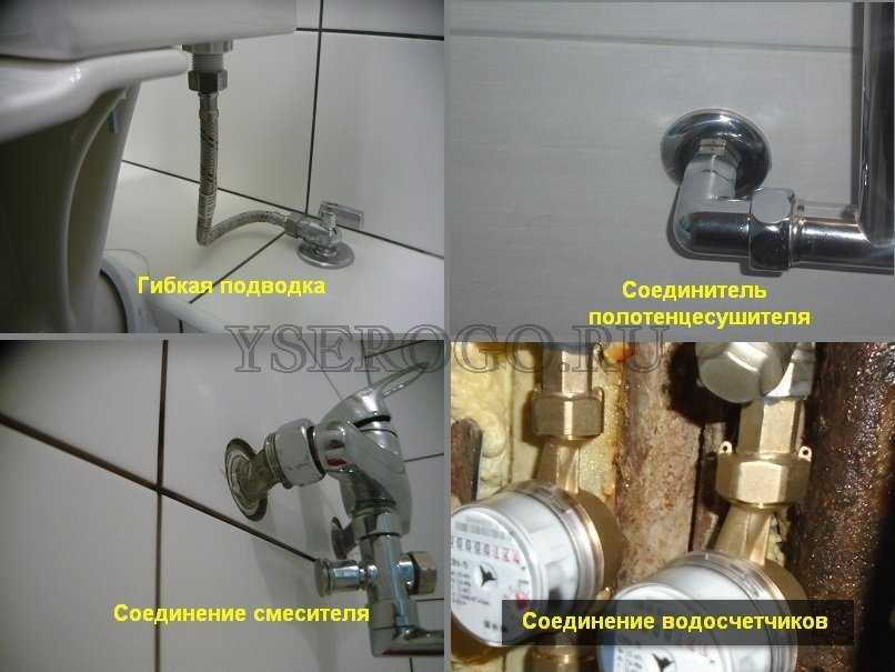 Таких примеров масса: соединение водосчетчика; соединение настенного смесителя с эксцентриками; гибкая подводка с гайкой; большинство хромированных соединителей для полотенцесушителя; разборная муфта для металла и полипропилена; соединение шланга подачи воды на стиральную машину и прочие.