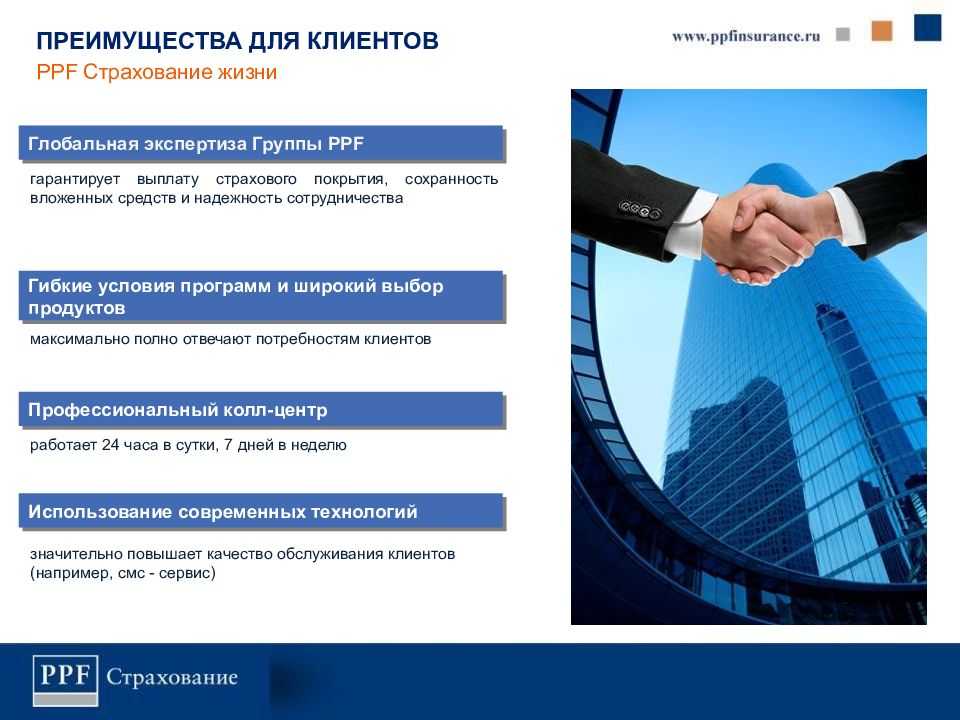 ООО «PPF Страхование жизни» более 14 лет на отечественном рынке страхования. Правильная стратегия и качественный пакет услуг позволили ей войти в список 15 успешных и крупных страховых компаний в России. Открыто более 75 агентств по всей территории страны Сочетание высокого уровня услуг страхования жизни и инвестиционную привлекательность, позволяют постоянно расширять клиентскую базу.