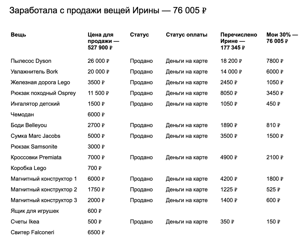 Всего для продажи ее вещей я создала 104 объявления. В некоторых из них одна вещь, в других — по две-три штуки. Все вместе они стоят 527 900 Р. Я уже выручила 177 345 Р. Из них мои 30% — 76 005 Р. Оставшиеся вещи я продаю до сих пор.