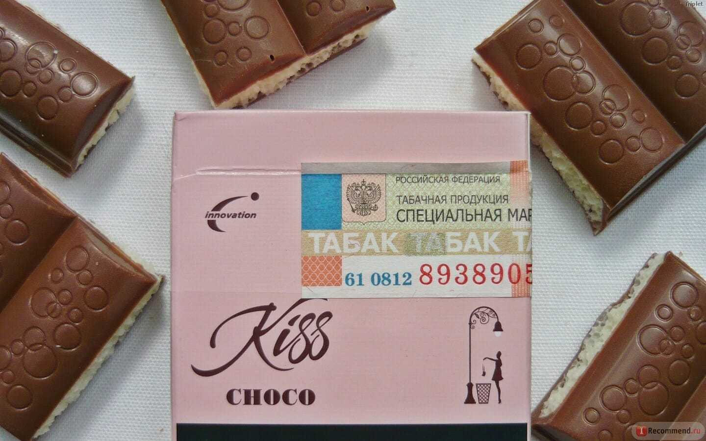 Эти тонкие шоколадные сигареты были впервые выпущены в честь десятилетия со дня первой произведенной пачки Kiss. Набивкой служит тонко нарезанный табак, собранный в разных уголках мира. Кисс шоколадные обладают достаточно легкими показателями крепости: никотин —, 0,4 мг/сиг, смола —, 5 мг/сиг.