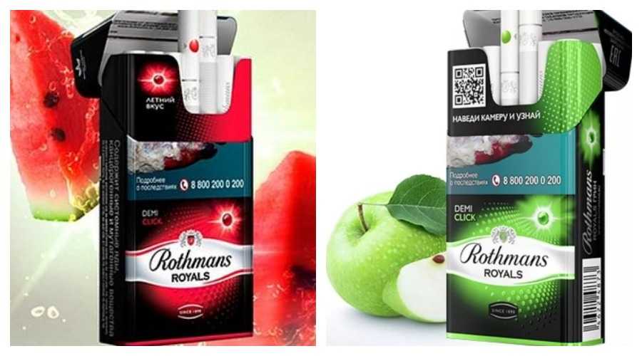 Компания Rothmans предлагает своим покупателям 2 варианта ароматизированных табачных изделий с капсулами: яблоко и арбуз. В обоих случаях можно выделить яркое оформление пачек: с арбузным наполнителем – в красно-черных тонах, с яблочной капсулой – яркий зеленый в сочетании с черным. упаковка выполнена из качественного прочного картона, который хорошо сохраняет форму. В пачке привычное количество изделий – 20 штук. Они имеют стандартный размер. На фильтре яркой меткой красного или зеленого цвета обозначено место расположения капсулы. После ее раздавливания вкус появляется сразу. Он отличается насыщенностью и яркостью. К яблоку и арбузу добавлен ментол, который остается в послевкусии. Отметим, что более востребован оказался продукт с арбузной капсулой. В нем потребители отмечают натуральность и сочность ощущений. Качество табака среднее. Используется мелкие и средние листы. Содержание никотина на уровне 0,6 мг, смолы – 6 мг.