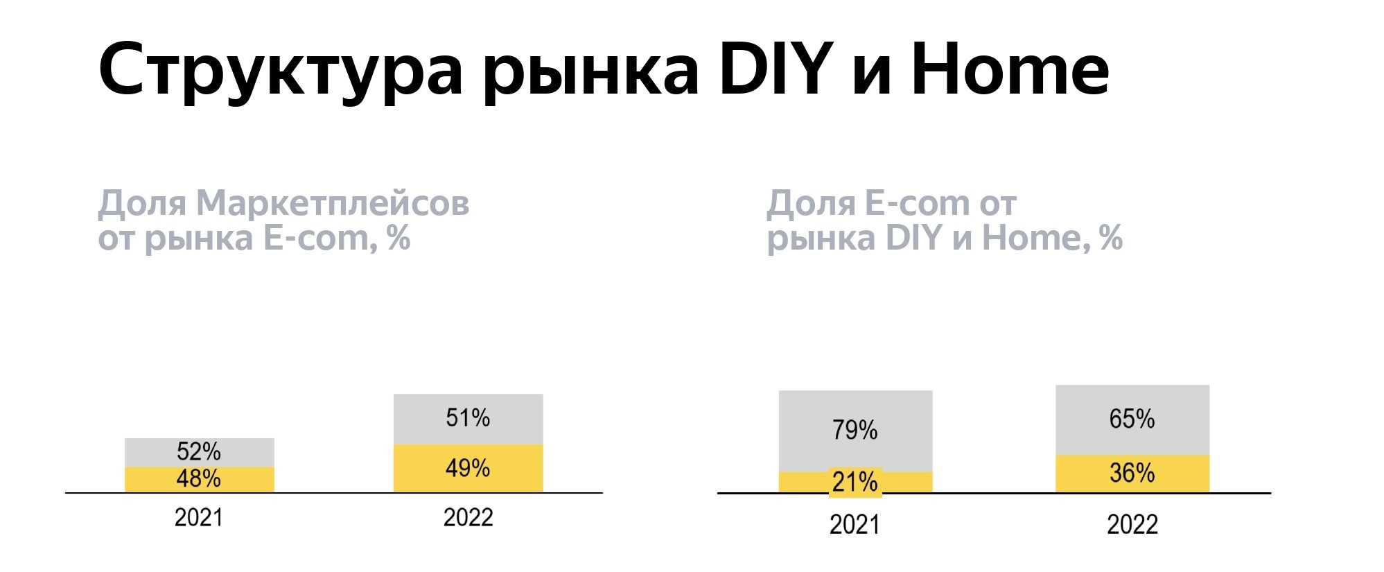 «Мы считаем, что в 2022 году доля онлайн-продаж в DIY-категории вырастет с 21 до 36% год к году. При этом на маркетплейсы будет приходится порядка 50% онлайн-продаж. Сам рынок тоже вырастет, в частности в силу повышения цен, нас ждет «рынок продавца».