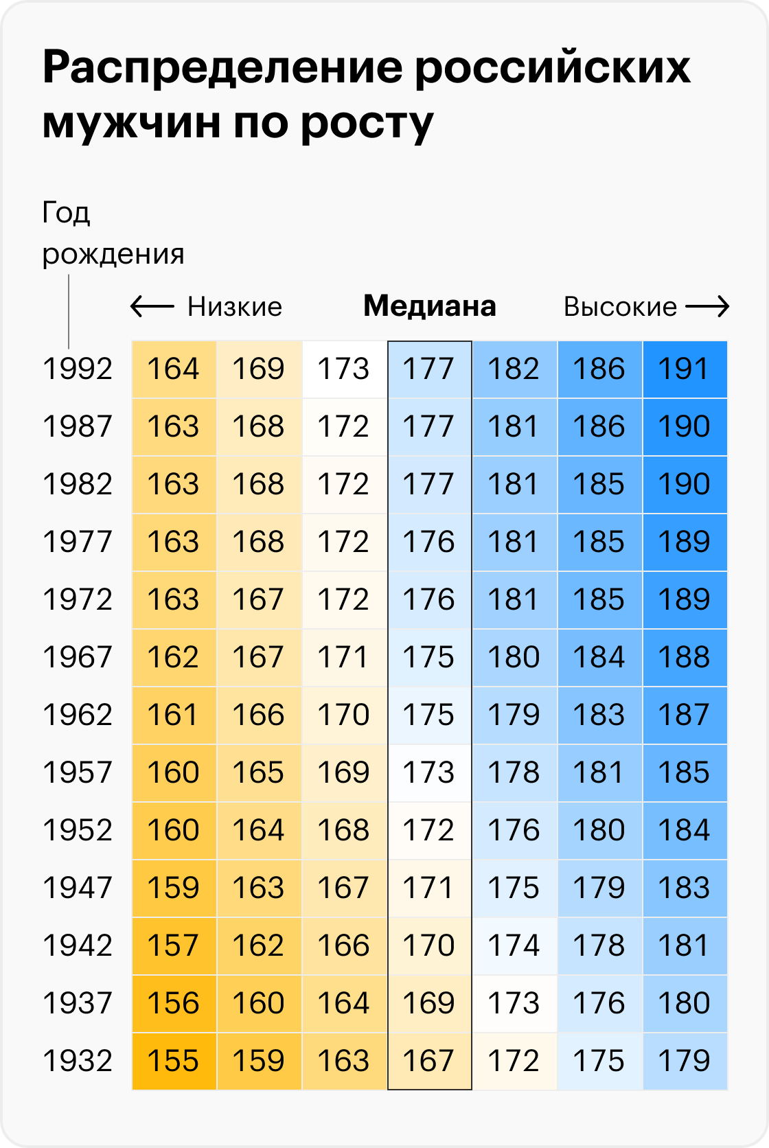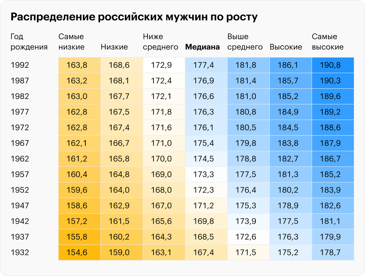 В таблицах ниже — распределения по росту для каждого поколения. Последние достаточно надежные данные — о родившихся в 1992 году. Чтобы приблизительно оценить интервалы для сегодняшних 20-летних, можно прибавить 0,7 см к наиболее поздним значениям.