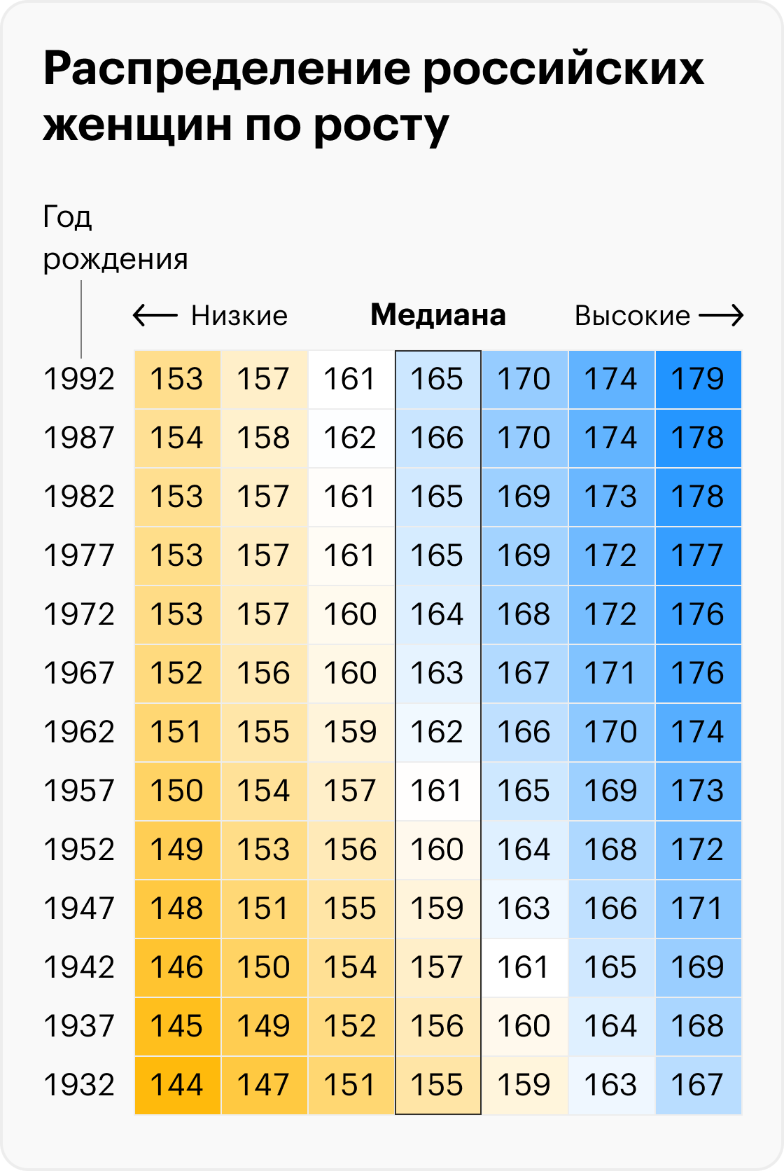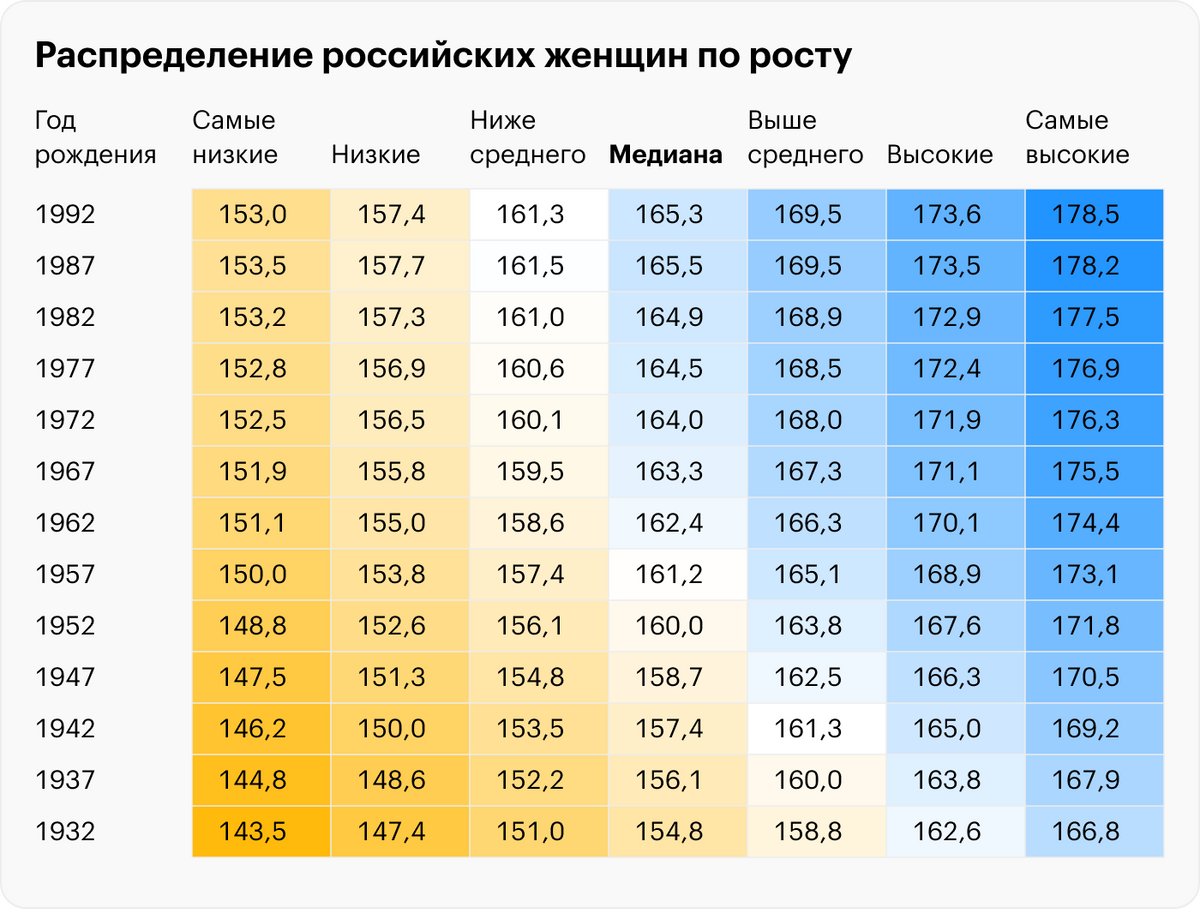 Если человек входит в 25% самых высоких, он попадает в категорию людей с ростом выше среднего, в 10% — в число высоких, в 3% — очень высоких. Аналогично и с границами низкого роста. Для россиянок 1992 года рождения границы высокого и очень высокого роста проходят на уровне 173,6 и 178,5 см соответственно.