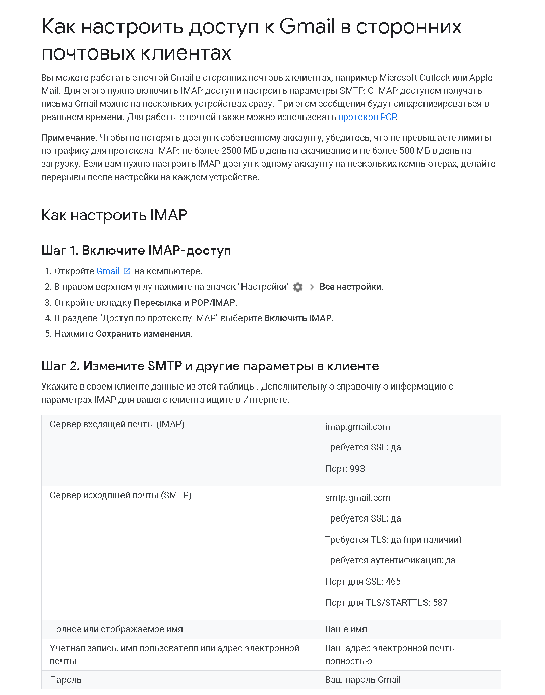 Дальнейшая последовательность действий такая же, как и при подключении почты Яндекс. Параметры для настройки соединения IMAP можно найти на сайте Google.