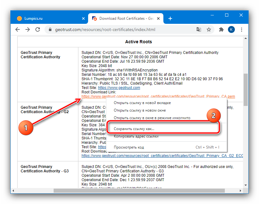 - Вверху таблицы должен быть блок с именем «GeoTrust Primary Certification Authority», взгляните на него – внизу должна быть ссылка, озаглавленная как «Root Download Link», кликните по ней ПКМ и выберите «Сохранить как…». Должен загрузиться документ в формате PEM.