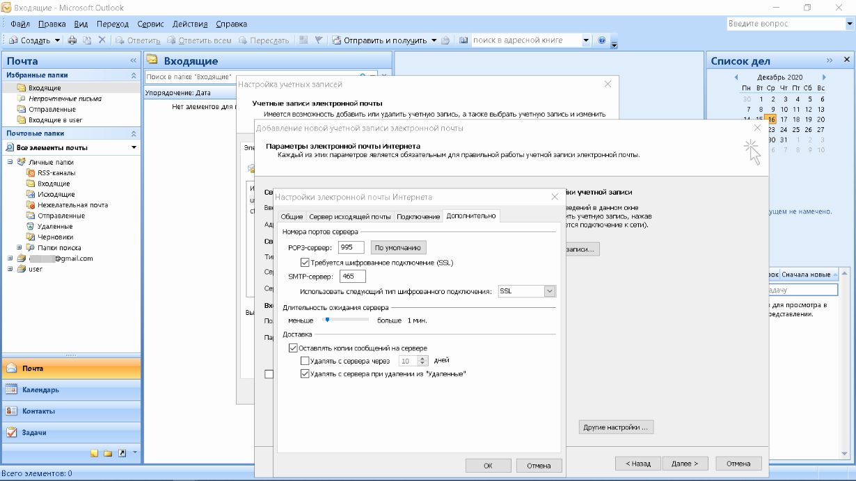 Чтобы лучше защитить данные, которые вы отправляете и получаете с помощью программы электронной почты, включите шифрование. Для этого установите флажок «Требуется зашифрованное соединение (SSL)» на вкладке «Дополнительно». Если вы хотите оставить письма, загруженные почтовой программой, на сервере, отметьте опцию «Хранить копию писем на сервере» и выберите период хранения и удаления.