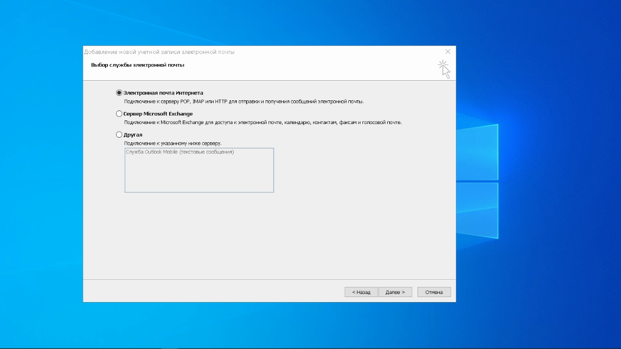 Теперь выберите службу электронной почты. В нашем случае это «электронная почта Интернета».