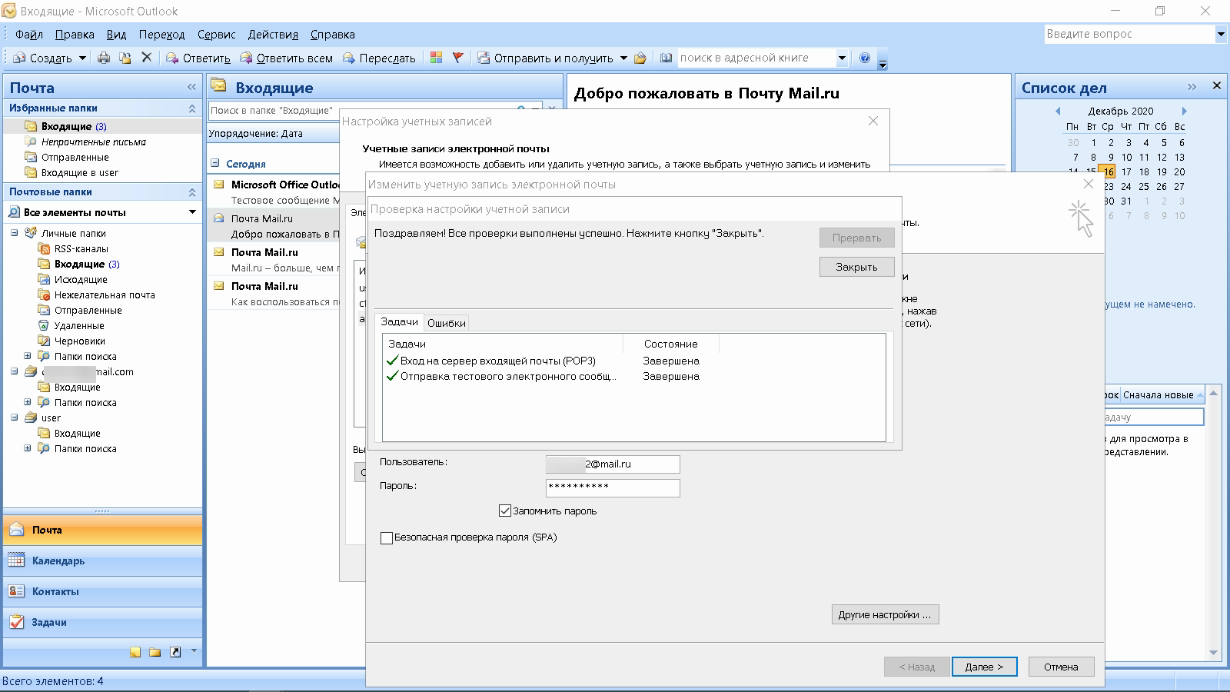 Используя кнопку «Проверить учетную запись», проверьте отправку и получение электронной почты. Если все было сделано правильно и система не сообщила о каких-либо ошибках, перейдите в интерфейс Outlook.